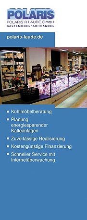 | Roll-Up, zwei Stück, wurden als Schnellschuss für die POLARIS R. LAUDE GmbH produziert. Die Produkte wurden auf einer kleinen Fachmesse für die Biomarktbranche eingesetzt und führten ihren Job exzellent aus. Sie lieferten nicht nur einen Qualitätssprung zur Präsentation des Unternehmens, sondern ermöglichten neben der Kundenbindung auch die effektive Gewinnung neuer Kunden. < < < |